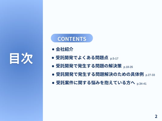 本レポートでは、委託開発で直面する一般的な課題に対して、効果的な解決策を実施したプロジェクトの成功事例を紹介しています。プロジェクトの運営手法や問題解決のアプローチ、成果を引き出すための戦略について実践的な例をもとに徹底的に解説します。 委託開発における課題を事前に理解し適切な対策を講じることで、より良い成果を得ることが可能です。