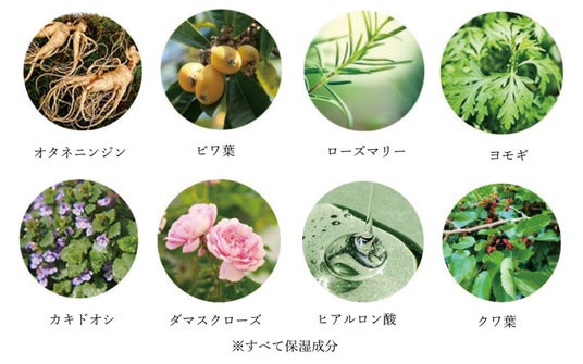 水、プロパンジオール、グリセリン、オタネニンジン根エキス、ビワ葉エキス、ローズマリー葉エキス、アスコルビルリン酸 Na、ヨモギ葉エキス、カキドオシエキス、ダマスクバラ花水、ヒアルロン酸Na、アルギニン、フィチン酸、クワ葉エキス、酸化銀