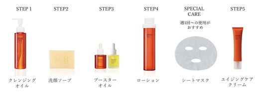 クレンジングオイル、洗顔ソープでお肌を整えていただいたのち、導入美容オイル(ブースターオイル、ブースターオイルスムース)、ローションをお使いいただいた後、スペシャルケアとしてシートマスクをお使いください。