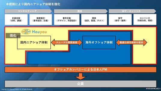 オフショアカンパニーは、国内ニアショア(九州・東北)とオフショア(中国・ベトナム・バングラデシュ)を中心とした、国内外の豊富なリソースを活用し、プロジェクトマネージャーを中心とした大規模開発の対応実績を有しています。そして、作り手・売り手・ユーザー、それぞれの視点で最適な支援方法を提供する強みを持っています。一方、寶結は、地方自治体向けのチャットボット開発や生成AI関連サービスで高品質なソリューションを提供しています。