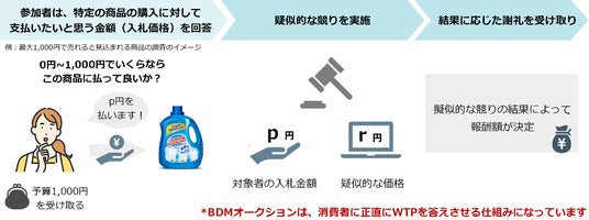 今回提供を開始する「BDMオークション」は、ノーベル経済学賞を受賞したVickreyのオークション理論に基づいた、精度の高い価格調査手法です。オークション形式の調査を通じて、参加者に実際にお金を使う決断を求めることで、仮想環境下でも正確に消費者の支払意思額(WTP)を測定することができます。