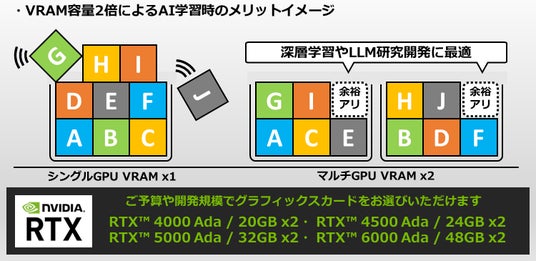 グラフィックスメモリ(VRAM)を48GBも搭載する「NVIDIA RTX(TM) 6000 Ada 世代」をはじめ、予算や研究開発規模に合わせてお選びいただける最新プロフェッショナルGPUをご用意。 1台のPCに2枚搭載し、合計で最大96GBという超特大容量のVRAMを用いることで、メモリ不足に陥りやすい深層学習やLLMの学習・解析などに余裕をもって処理することができます。