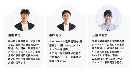 発展めまぐるしいAIやノーコードといった新しいテクノロジーと事業開発、補助金、マーケティングなどのビジネスのノウハウを掛け合わせることで皆様の事業の成功にコミットいたします。
