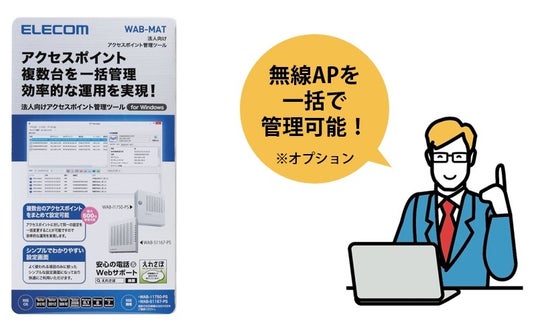 低コストで手軽に機器管理を実現できる、法人向けアクセスポイント管理ツール「WAB-MAT」に対応。複数のアクセスポイントをまとめて設定可能なため、多台数導入時の管理工数を削減できます。また、死活監視やログ管理によりトラブル発生時にすばやく対応できます。(管理ツール「WAB-MAT」は30日間無料トライアル付きの有償ソフトウェアです)