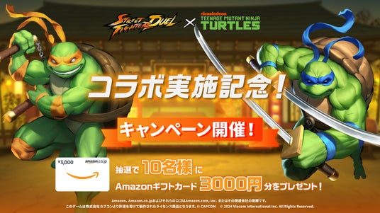 『TMNT』と『ストリートファイター:デュエル』とのコラボを記念して、『ストリートファイター:デュエル』公式X(@sfd_jp)では、抽選で10名様に3,000円分のAmazonギフトカードをプレゼントするキャンペーンを開催いたします。