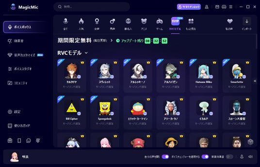 最新発表されたMagicMicはRVC音声モデルをサポートし、人気のアニメ・ゲームキャラ/俳優/歌手など250+AI音声を追加し、毎日限定の無料音声を引き続き更新します。リアルタイムで高品質の音声を変換できます。また、800+面白い効果音も提供します。同時に、ユーザーにより良いエクスペリエンスを提供するために、遅延とノイズの問題も改善されました。