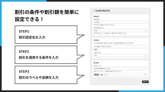 割引の設定名、適用条件、ラベルや金額を入力するだけで設定可能