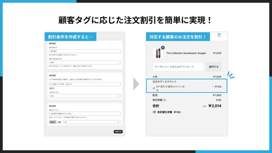 注文割引設定を作成(左)すると、特定のタグを持つ顧客に割引を適用(右)