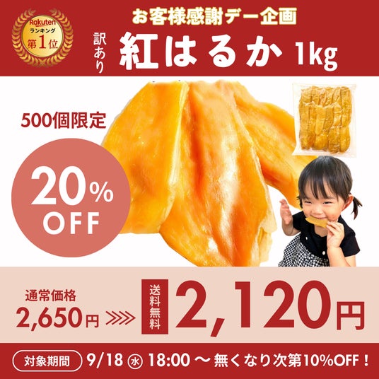 創業からわずか2年で、ネット通販1日1万件以上の注文を記録し、楽天市場で総合ランキング1位を獲得した芋國屋が楽天お買い物マラソンに向けて9/18~『人気No,1訳あり紅はるか干し芋 1kg』をセール価格での販売を4回開催いたします。