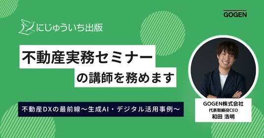 不動産売買支援ハブ「レリーズプラットフォーム」の開発・提供をするGOGEN株式会社(本社:東京都港区) の代表取締役CEO:和田 浩明が、本日9月19日(木)に開催されるにじゅういち出版主催のセミナー「不動産DXの最前線 ~生成AI・デジタル活用事例」の講師を務めます。