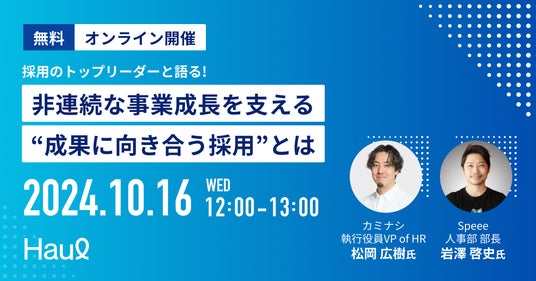正式ローンチを記念し、2024年10月16日(水)12:00~13:00 に、RekMA導入企業であるSpeee 人事部 部長の岩澤哲史氏、カミナシ 執行役員 VPofHRの松岡広樹氏と「成果に向き合う採用」についてのセミナーを開催します。