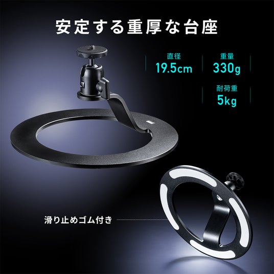 - 卓上での使用に最適な小型設計と、360度調整可能なボールジョイント搭載