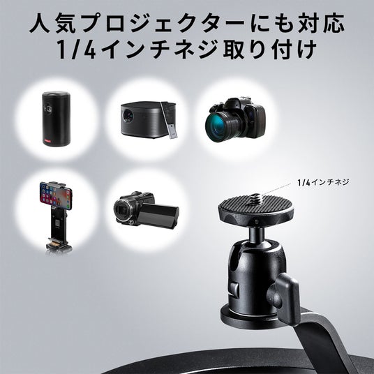1/4インチネジに対応しているため、プロジェクター以外にもカメラやスマートフォンホルダーなど、様々な機器を取り付けることができます。これにより、一台で多様な用途に対応できる汎用性の高いスタンドとなっています。
