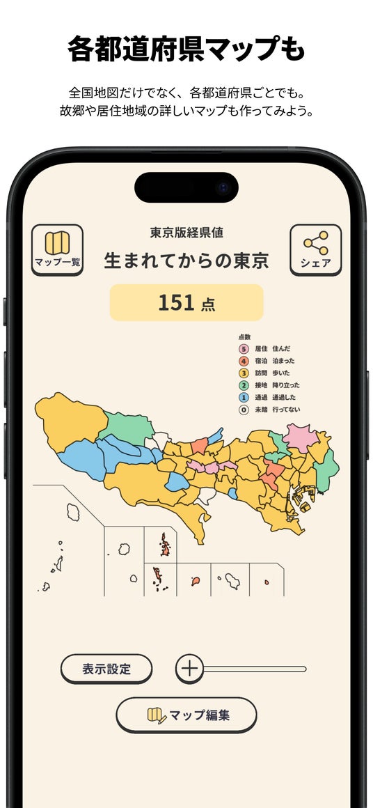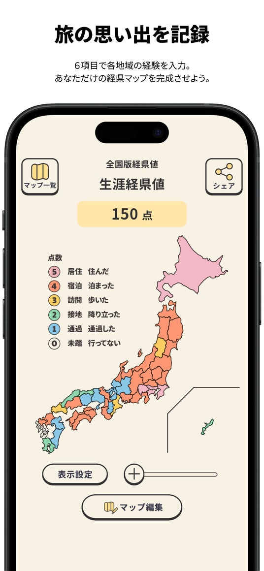 経験値(R)は全国47都道府県の経験を6つのレベルに分けて判定し日本地図で色分けした「経県値マップ」を作成し、得点合計を記録するサービスです。2005年にWEBサービスとして発表され、2018年にアプリ化されました。
