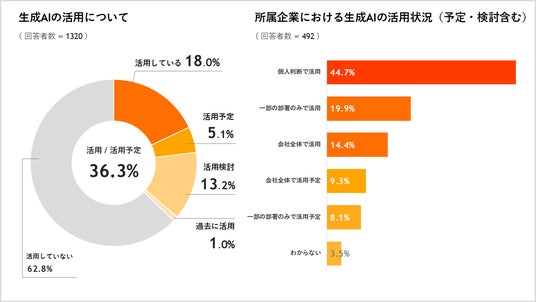 近年、さまざまな領域で活用が進んでいる生成AIを、18.0%が「業務で活用している」と回答。昨年の「ChatGPT」利用率9.0%(※2)と比べ利用者は増加傾向であることが窺えます。「個人の判断で利用している」の回答が44.7%と最も多い結果となりました。