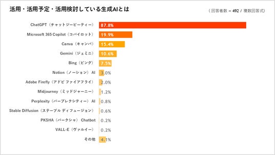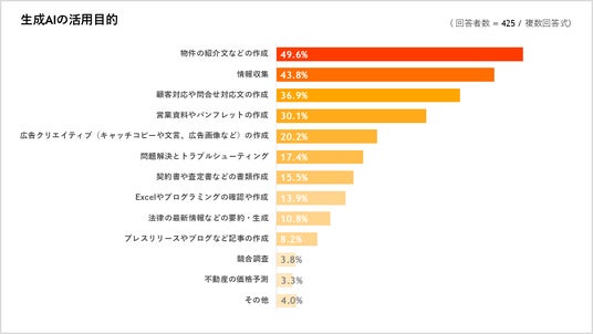 なお、活用している生成AIは「ChatGPT」が87.8%と最多で、利用目的は「物件の紹介文などの作成」 や「情報収集」、「顧客対応や問い合わせ対応文の作成」などが挙げられました。