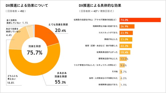 「DXに取り組んでいる/いた」と回答した人へ、DXの効果について質問したところ、「とても効果を実感している」は20.4%、「まあまあ効果を実感している」は55.3%と、合計75.5%が効果を実感。具体的な効果は「従業員の生産性が向上した」が74.0%、「残業時間を大幅に削減できた」が26.9%、「コストカットができた」が23.9%でした。