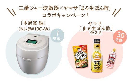 プレゼントは三菱ジャー炊飯器「本炭釜 紬」もしくはヤマサまる生ぽん酢を含むヤマサ人気商品セット。応募期間は2024年10月8日(火)15時まで!