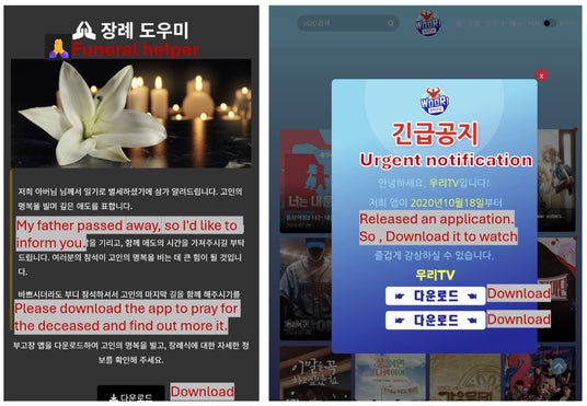韓国のユーザーを狙うモバイルマルウェアは、主に巧妙なフィッシングキャンペーンを通じて拡散されます。このような偽のキャンペーンでは、テキストメッセージやソーシャルメディア上のダイレクトメッセージを利用して有害なリンクを送信します。メッセージの背後にいる攻撃者は、多くの場合、組織や信頼できる人物を装い、ユーザーを騙してリンクをクリックさせます。リンクがクリックされると、正規サイトの外観を模倣した、本物そっくりの偽のウェブサイトに誘導されます。こういった偽サイトは通常、アプリのダウンロードを促し、マルウェアがデバイスにインストールされる仕組みになっています。用心深く、クリックする前にメッセージやリンクの信憑性を確認することが肝心です。