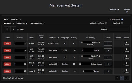 2. 管理者ページ: 公開されたインデックスページに従って操作すると、被害者を管理するために設計された管理ページにたどり着きます。これらのページには、デバイスのリストが表示され、デバイスの情報や制御可能なさまざまなアクションが表示されていました。被害者の数が増えるほど、デバイスのリストも増えていきます。