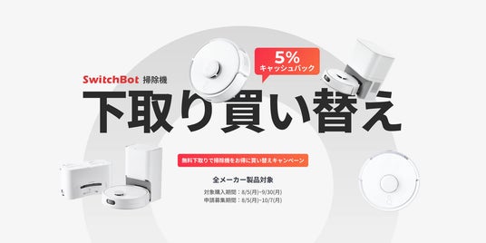 下取りサービスキャンペーン期間に、対象となる製品(SwitchBotのロボット掃除機製品すべて)を購入し、いらなくなった掃除機を下取りに出すと、購入価格からさらに5%の金額をキャッシュバックいたします。