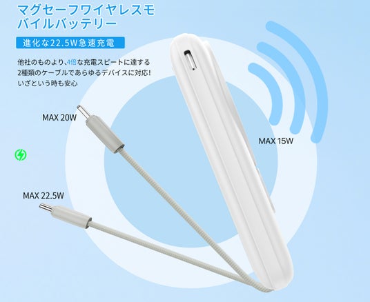 持ち運びに便利な内蔵Type-Cケーブル(最大出力22.5W)とLightningケーブル(最大出力20W)を搭載。さらに、無線充電も同時に行えるため、最大3台のデバイスを同時に充電可能です。ケーブルを忘れる心配もなく、外出時にも手軽に充電ができ、家族や友人と一緒に使っても安心。どんなデバイスもフルパワーに保つ、究極のモバイルバッテリーです。