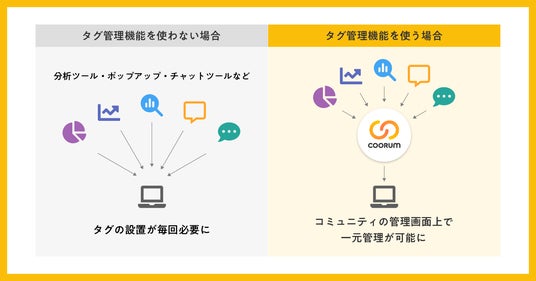 タグ管理機能を活用することで、「coorum」を活用したコミュニティの管理画面からノーコードで対応できるようになりました。コンバージョンの把握やサイト分析などに使う独自のタグを、簡単に追加、更新できます。