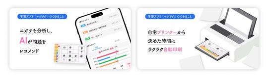 「マジタク」は、毎日のテストの分析をスマホアプリで確認し、不得意分野を可視化。お子様一人ひとりに合わせて、今学習すべき問題をお勧めします。さらにご自宅のプリンターと連携し、アプリで設定した時刻にオリジナルの問題セットを自動印刷。自宅学習の最適化を図ります。
