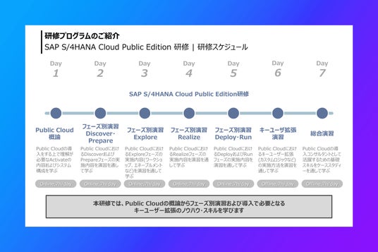 SAP S/4HANA Cloud Public Edition研修Public Cloud導入のためのActivateメソドロジーと、各フェーズ(Discover、Prepare、Realize、Deploy、Run)で実施すべきタスクを理解し、演習を通じて具体的なスキル強化を目指します。