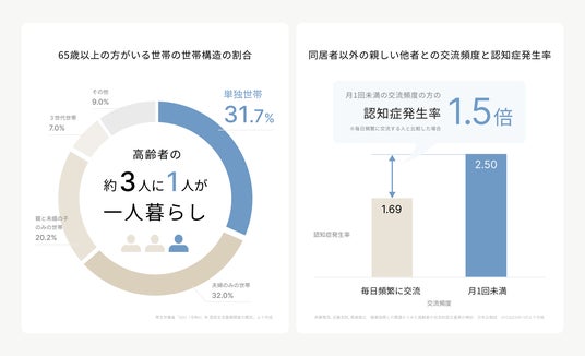 日本における高齢化の進行により、65歳以上の3人に1人が一人で暮らす一方(※1)、他者との交流が月一回未満だと、毎日交流のある人に比べて認知症リスクが1.5倍高いというデータもあります。(※2)