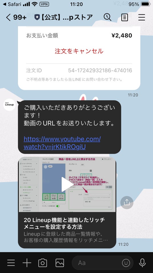 対象の商品を購入すると、自動でLINEメッセージが送られてきます。