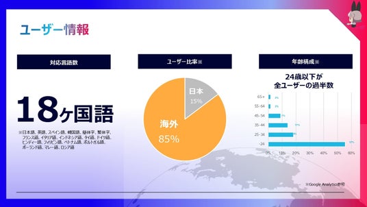 サービスの開始から世界に向けたプロダクト作りを続けており、対応言語数は18カ国語、ユーザーの海外比率は85%にまでのぼるサービスとなりました。ユーザーの年齢層は24歳以下が最も多く、若年層に支持されています。