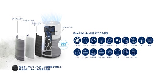 さらに、ファン&モーターが最適化され、360°全方向からパワフルに空気を吸引します。また、ブルーエア社が独自に開発した高性能フィルターで花粉やホコリ、PM2.5やウィルス、バクテリアなどの微粒子を除去し、ココナッツカーボンを練り込んだ除臭カーボンシートがニオイにも効果を発揮、空気中の有害物質をしっかり除去します。