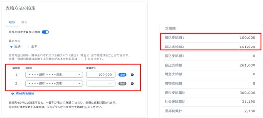 1. 複数支給先の設定で従業員ごとに異なる銀行口座へ給与・賞与を振り分け可能になりました
