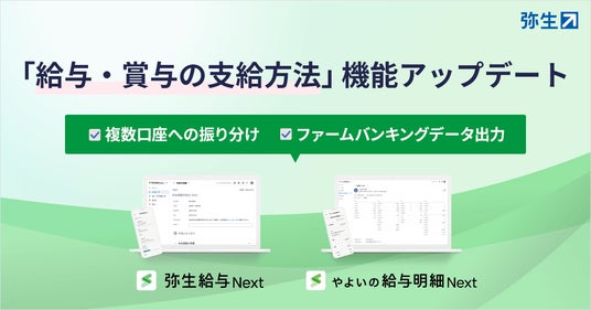 弥生株式会社(本社:東京都千代田区、代表取締役 社長執行役員:前山 貴弘、以下「弥生」)は、クラウド給与サービス「弥生給与 Next」および「やよいの給与明細 Next」において、給与・賞与の支給方法設定機能を新たにリリースしました。これにより、従業員ごとに支給先を複数設定し、給与や賞与を異なる口座へ振り分けて支給できるようになりました。また、ファームバンキングデータの出力機能も搭載し、銀行振込業務をスムーズに行えるようになりました。