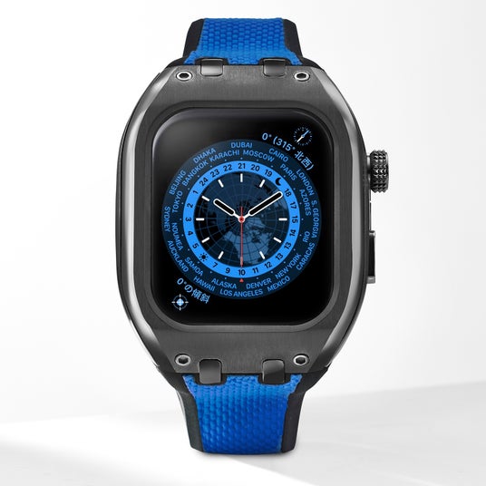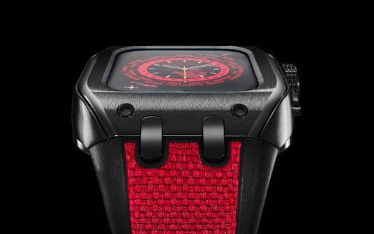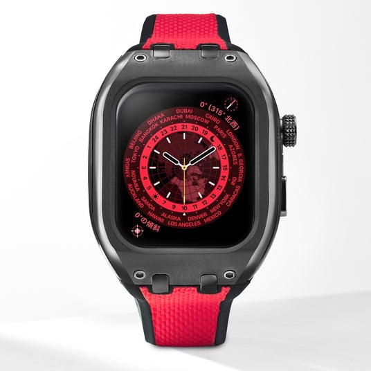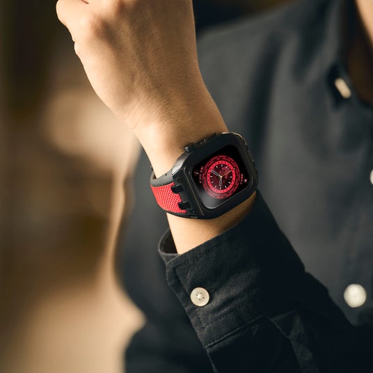 アップルウォッチSeries9/8/7に対応した新作。シックなブラック・ケースにレッドとブルーのベルトを纏った、大人のアクティブスタイル。ケースには医療用品にも使われる316Lステンレススチールを使用し、表面をヘアラインに仕上げ高級感を演出。ベルトは再生ファブリックに柔らかなラバーを貼り合わせ、防水性と使用感を向上した逸品。