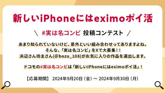 新しいiPhoneには「eximo ポイ活」!「新しいiPhone」×「eximo ポイ活」に匹敵する「#実は名コンビ」をXで大募集!NTTドコモ「#実は名コンビ 投稿コンテスト」9月20日(金)開始