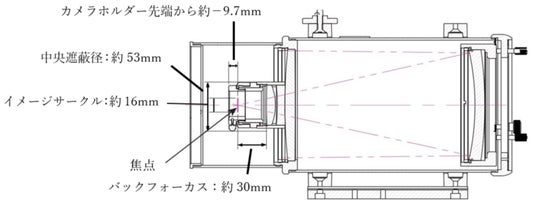 ・カメラは補正レンズの中央にあるカメラホルダーに取り付け、カメラホルダーに装備されているピントリングを回転させて焦点を合わせます。取り付け可能なカメラはアメリカンサイズ(31.7mm)ノーズピースを有するもの、またセンサー位置がノーズピース基部から9.7mm以上あるものに限られます。イメージサークルは約16mmです。