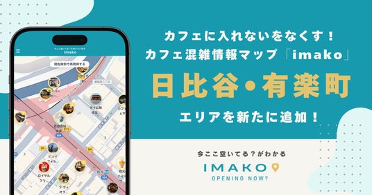 株式会社imako(本社:東京都渋谷区、代表取締役: 浜田真衣 以下、imako)は、「今ここ空いてる?がわかる」カフェ混雑情報マップimako(いまこ)に、新たに「日比谷・有楽町」エリアを追加したことをお知らせします。imakoは、「どのカフェも混んでいて入れない」という課題を解決するために誕生したサービスです。