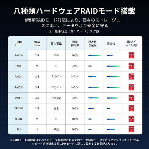 本製品は、最大100TBのデータ容量に対応したUSB3.0 HDD ケースです。 RAID機能搭載で、RAID0、RAID1、RAID3、RAID5、RAID10、Span、PM、Cloneの計8種類のRAIDモードにより、安心してお使いいただけるストレージ環境を構築しております。