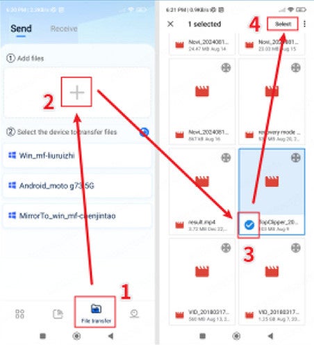 ステップ2. 「ファイル転送」機能を選択します。「ファイル追加」をタップしてから、転送したいフィアルを選択します。