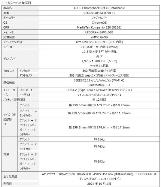 製品情報:https://www.asus.com/jp/laptops/for-home/chromebook/asus-chromebook-cm30-detachable-cm3001/