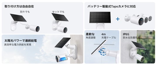 - 取り付け方は自由自在: ソーラーパネルとTapoカメラを1つの台座にまとめて取り付けることはもちろん、付属の延長ケーブルで個別に設置することも可能です。
