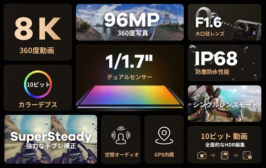 本体には2.19インチのタッチスクリーンを搭載し、撮影パラメーター設定やモード切り替え、プレビュー再生などを画面上で簡単に行うことができます。 撮影機能には、ループ録画、タイムラプス撮影、インターバル撮影、超長時間露光が追加されています。 後編集では、QooCam 3アプリまたはQooCam Studio 2.0を使用して、効率的で簡単な360度編集を行うことができ、高品質の360度映像を簡単にエクスポートすることができます。