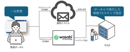 S3対応のNAS、Windows、Linuxサーバなどのデータを Wasabi Hot Cloud Storage に直接ファイルバックアップをし、作業完了を通知するサービスとなります。