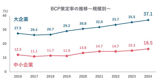 帝国データバンクが全国2万7,104社を対象としたBCPに関する調査(※)のBCP策定率を企業規模別にみると、BCPを策定している大企業は37.1%なのに対して、中小企業は16.5%と企業規模で差が生まれていることが分かります。