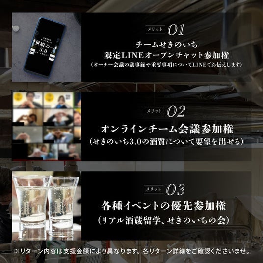 本プロジェクトを応援購入した人は、日本酒タンクオーナーとなり、オーナーは酒質設計会議に参加して、今回つくる日本酒スパークリングの酒質決定権が与えられます。