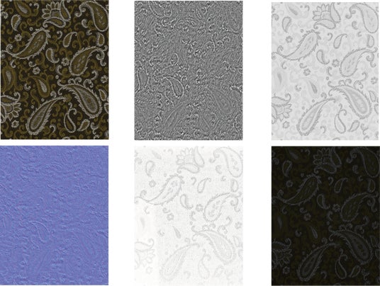 テクスチャはリアリティを加えるために、特性(透過性、光沢、粗さ、色など)を詳細に設定するために6つのマップで構成されています。