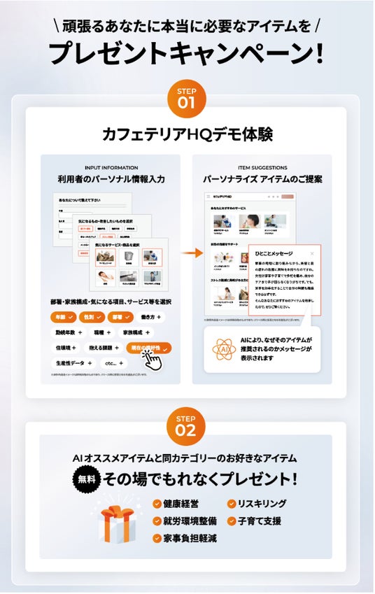出展期間中は、国内初(※)・AIを活用した福利厚生プラットフォーム「カフェテリアHQ」(https://hq-hq.co.jp/cafeteria)のデモを体験いただけます。