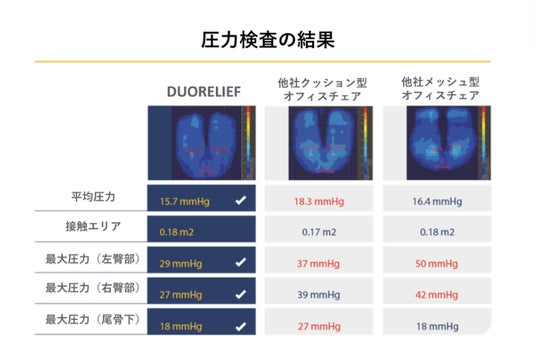 従来のオフィスチェアの座面と比較して、臀部及び尾骨部分への圧力を低減させます